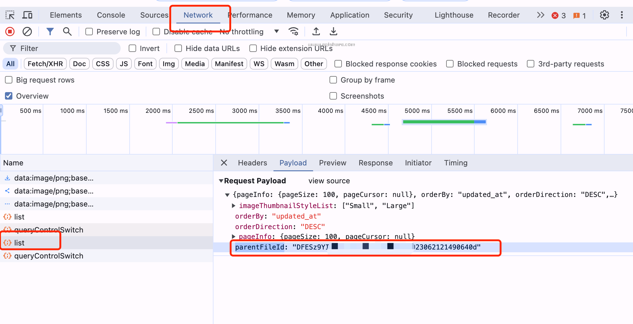 目前只有一个 list 请求,看到请求参数中有个“parentFileId”参数,很有可能是。